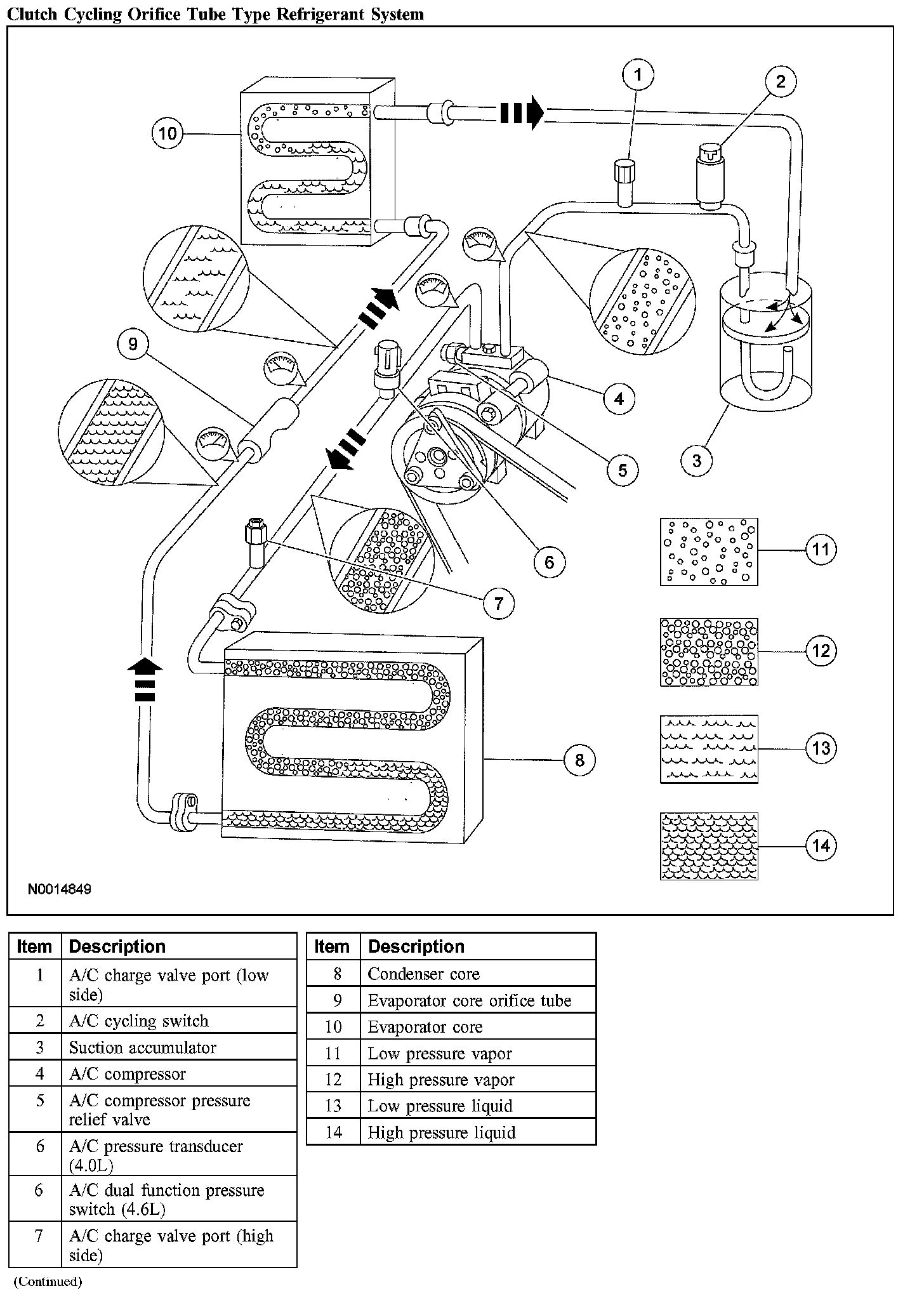 The high side line pressure is also monitored so that A/C compressor operation can be interrupted if system pressure becomes too high. When the A/C compressor discharge pressure rises, the A/C dual function pressure switch contacts open (4.6L) or the A/C pressure transducer value changes (4.0L), disengaging the A/C compressor. When the pressure drops, operation of the A/C compressor resumes.