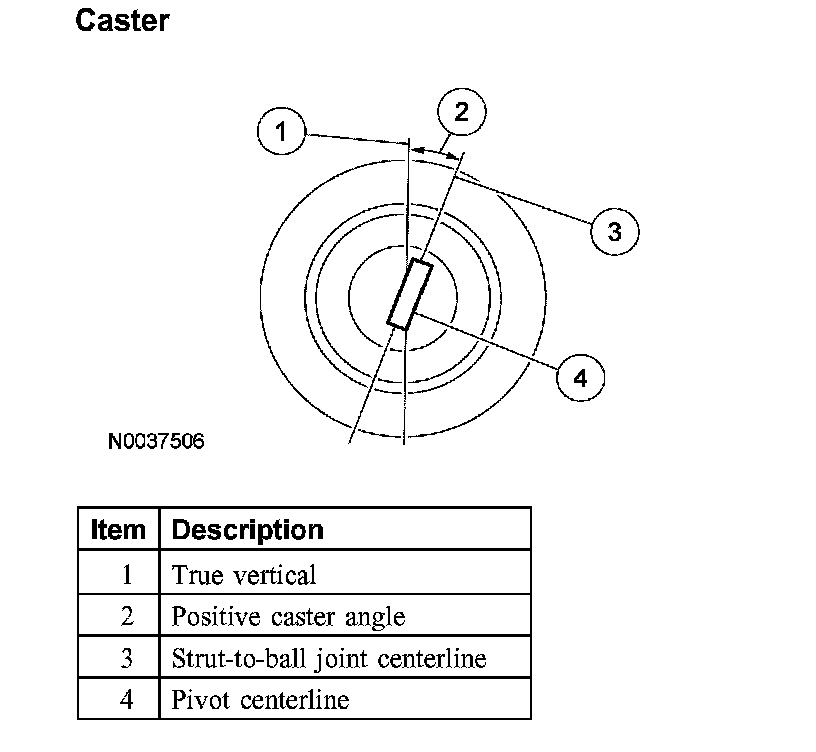 Caster is the deviation from vertical of an imaginary line drawn through the pivot points (top of strut and lower ball Joint), when viewed from the side. The caster specifications will give the vehicle the best directional stability characteristics when loaded and driven. The caster setting is not related to tire wear.