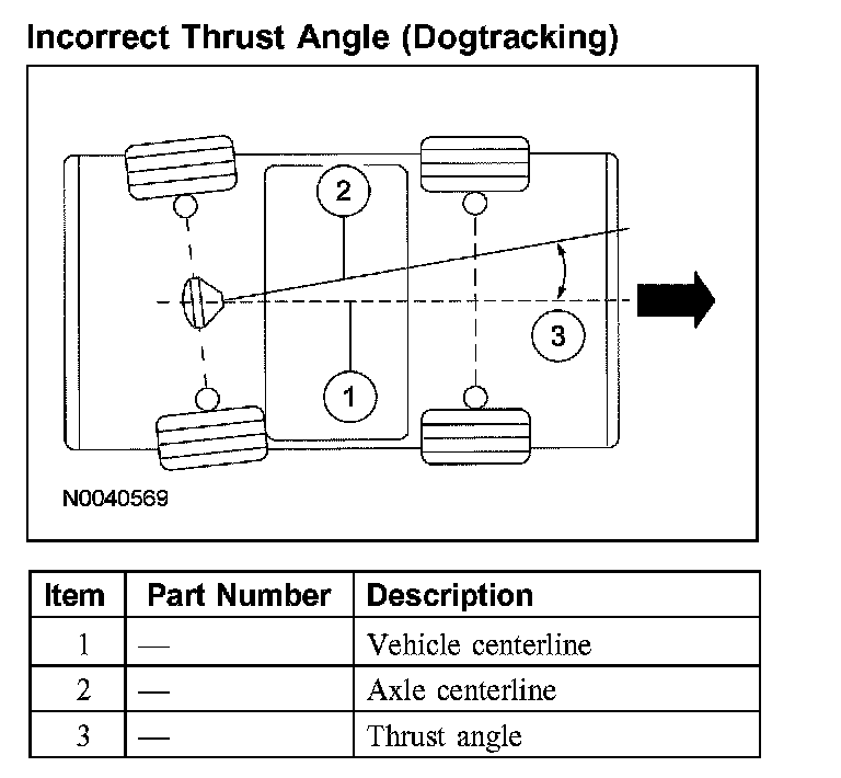 Incorrect thrust angle (also known as dogtracking) is the condition in which the rear axle is not square to the chassis. Heavily crowned roads can give the illusion of dogtracking.