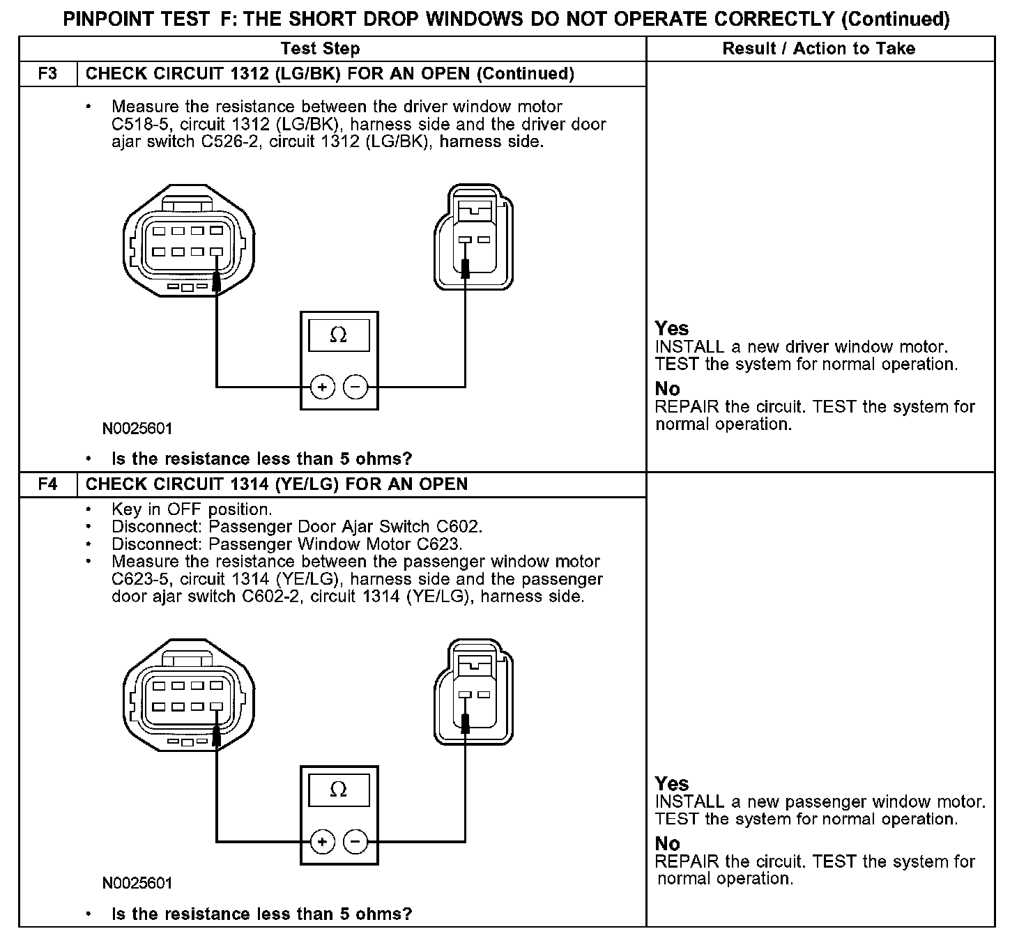 The short drop window feature is activated when one (or both) of the doors are opened, which opens a door ajar switch. When the driver door is opened (opening the driver door ajar switch), a signal on circuit 1312 (LG/BK) is interpreted by the driver window motor that the driver door is open. The driver window motor then carries out the short drop function on the driver window. When the passenger door is opened (opening the passenger door ajar switch), a signal on circuit 1314 (YE/LG) is interpreted by the passenger window motor that the passenger door is open. The passenger window motor then carries out the short drop function on the passenger window. This feature is on both the coupe and the convertible.