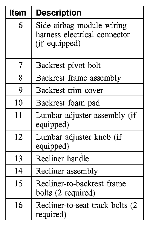 9. WARNING: Front seat backrest trim covers installed on seats equipped with side air bags cannot be repaired. New trim covers are to be installed (cleaning is permissible).