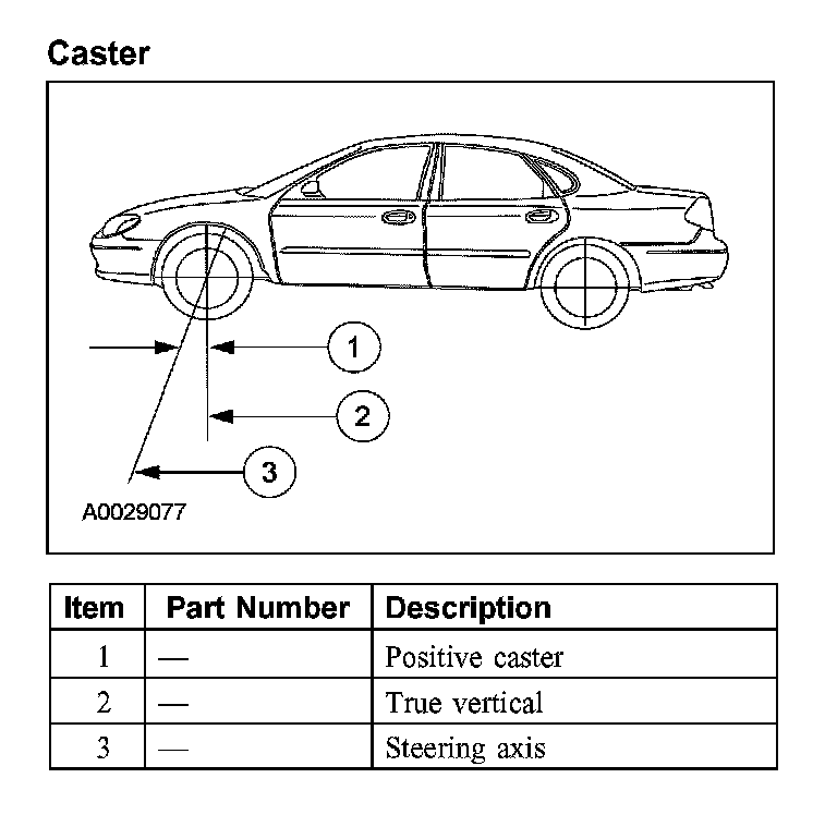 Caster is the deviation from vertical of an imaginary line drawn through the ball joints when viewed from the side. The caster specifications will give the vehicle the best directional stability characteristics when loaded and driven. The caster setting is not related to tire wear.