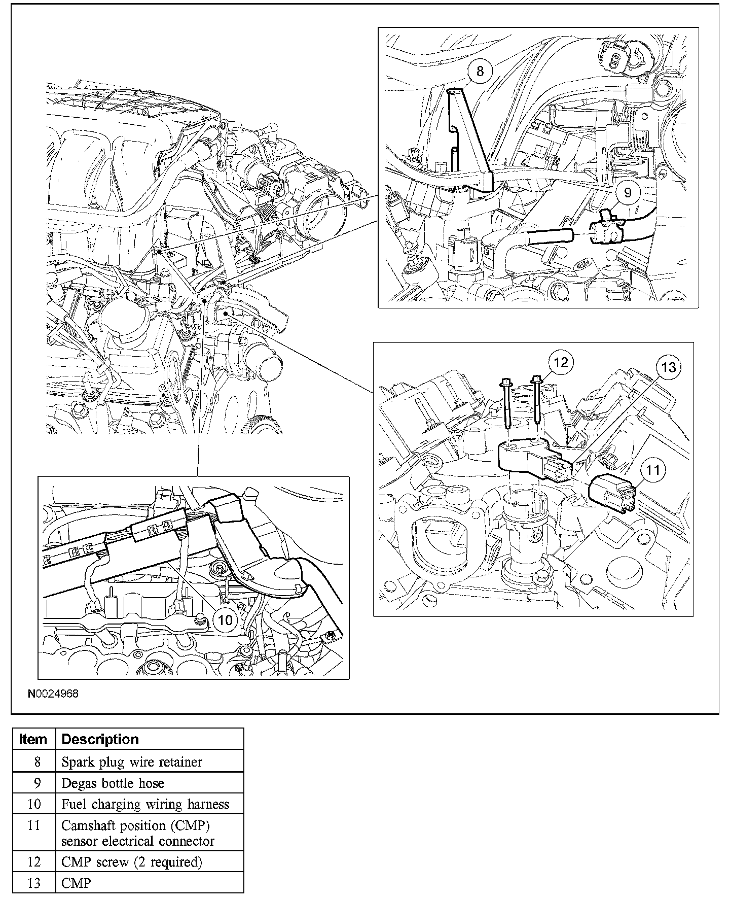 8. Release the fuel charging wiring harness from the valve cover studs and position the wiring harness away from the camshaft position sensor.
