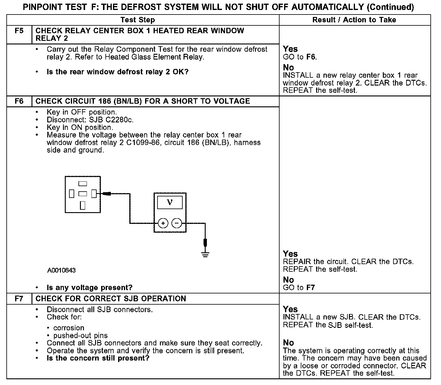 The smart junction box (SJB) generates a voltage signal to the rear window defrost switch through circuit 1010 (DB/OG). The rear window defrost switch is grounded through circuit 651 (BK/YE). When the switch is engaged and the ignition switch is in the RUN position, the SJB supplies a ground signal and activates the rear window defrost relay 1. This supplies voltage to the relay center box 1 on circuit 186 (BN/LB) and activates rear window defrost relay 2. The rear window defrost relay 2 provides voltage to the rear window defrost grid on circuit 185 (BK). The rear window defrost grid is grounded through circuit 57 (BK). The SJB maintains the ground signal for 10 minutes or until the switch is selected OFF or the ignition switch is turned to OFF or ACC.