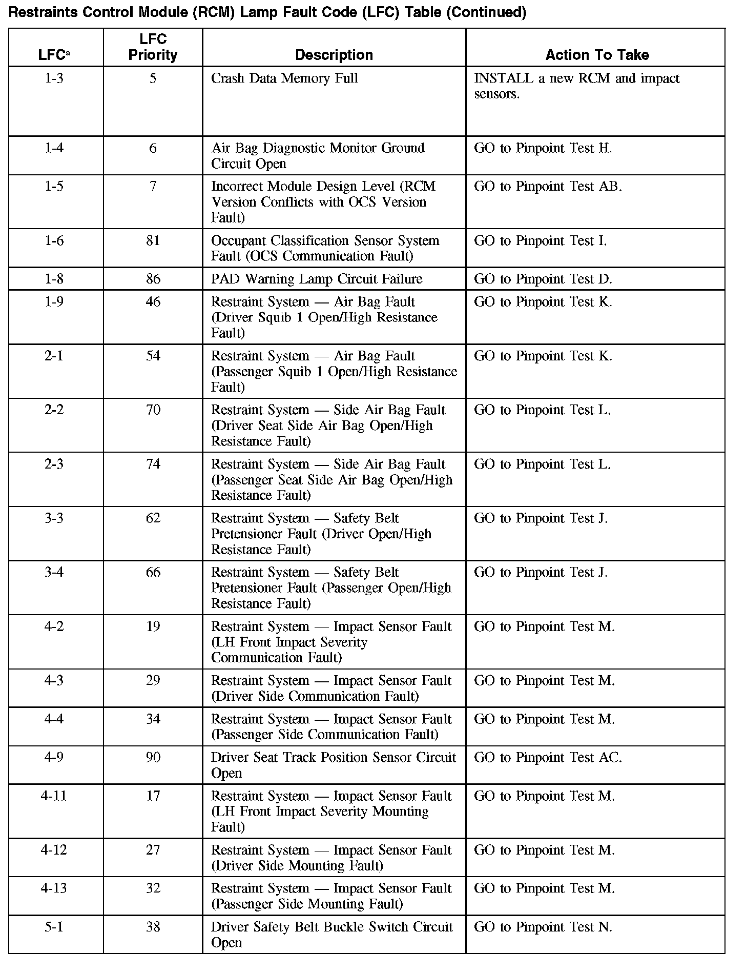 Restraint Control Module (RCM) Lamp Fault Code (LFC) Table (Part 2):