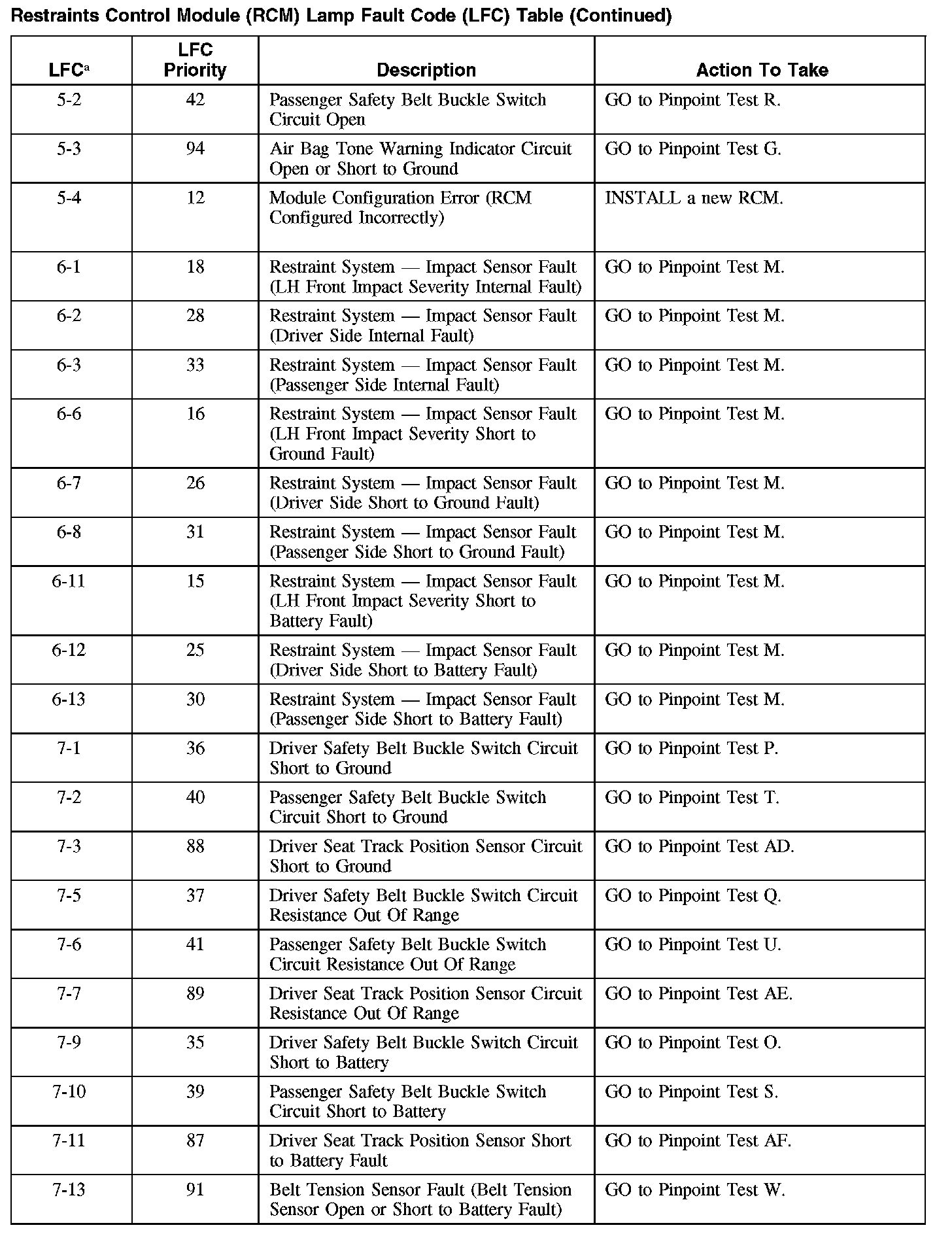 Restraint Control Module (RCM) Lamp Fault Code (LFC) Table (Part 3):