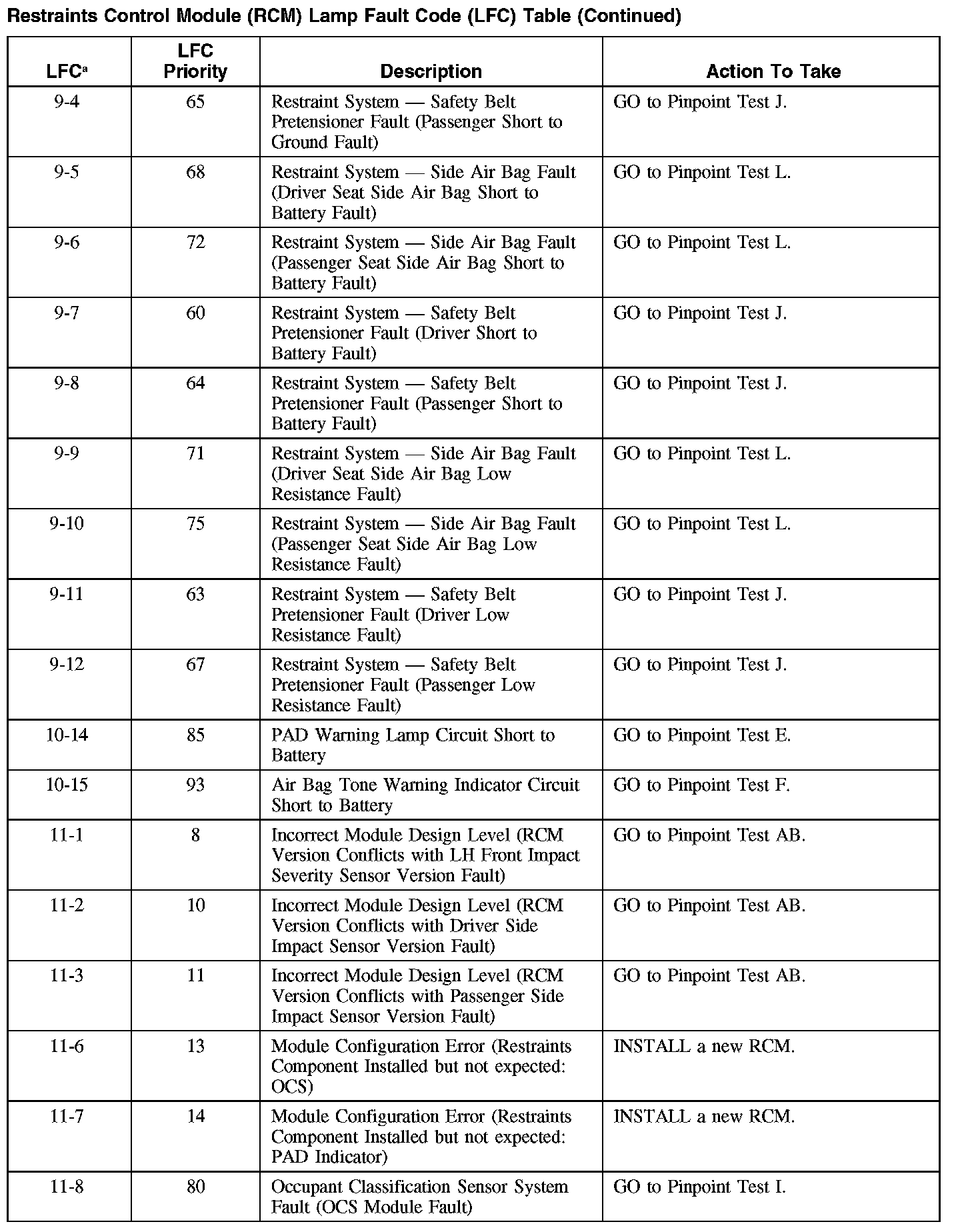 Restraint Control Module (RCM) Lamp Fault Code (LFC) Table (Part 5):