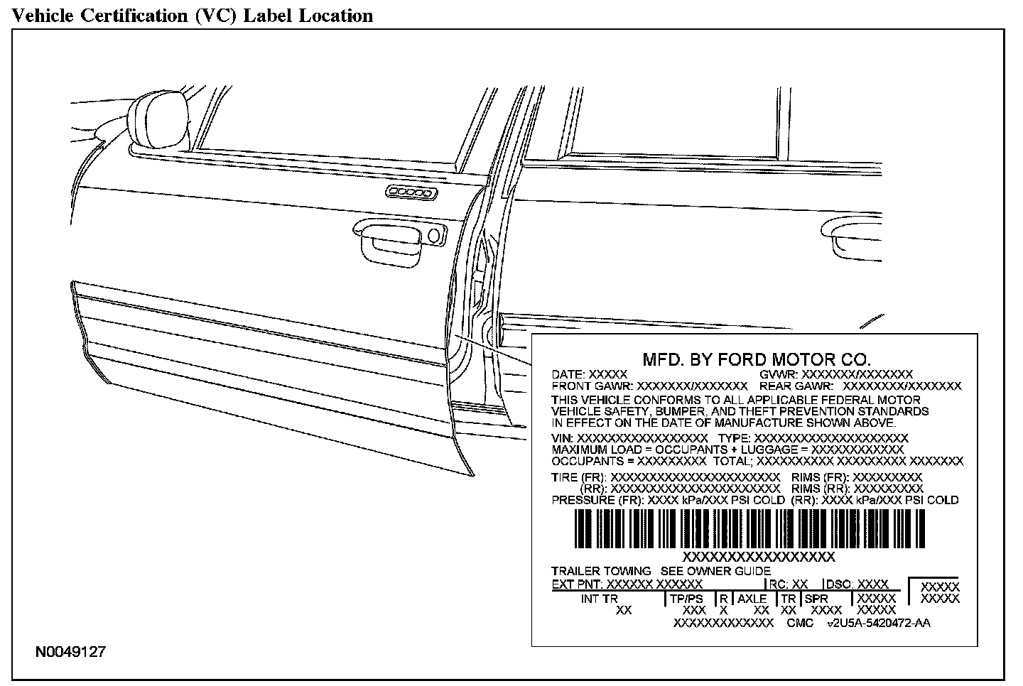 The upper portion of the vehicle certification (VC) label contains the manufacturer name, the month and year of manufacture, the certification statement and the VIN. It also includes gross vehicle weight ratings (GVWR) as well as tire size and pressure ratings. The VC label is located on the left-hand front door edge.