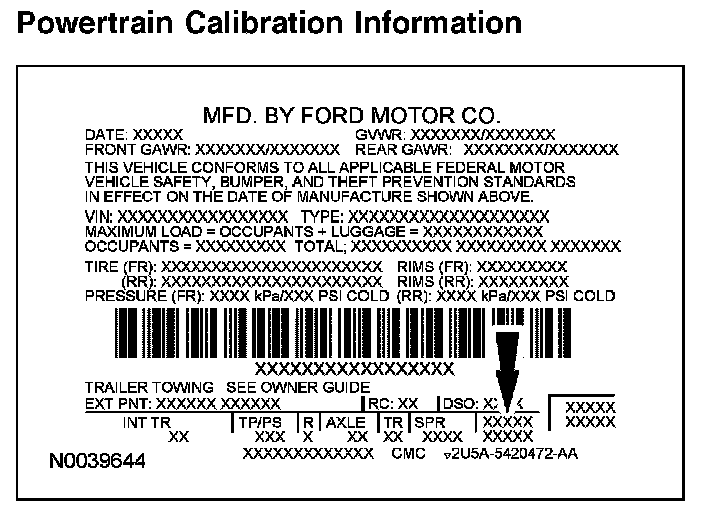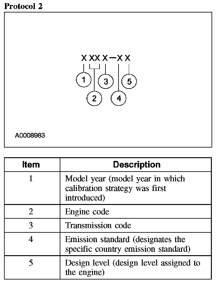 Powertrain calibration information is printed in the lower right corner of the Vehicle Certification Label. Only the base calibration information is printed. Revision levels will not appear, however, they can be found in On Line Automotive Service Information System (OASIS). For the current model year, Ford Motor Company is using 3 different protocols which describe powertrain base calibration. These Protocols are designed to provide worldwide standardization for vehicle calibration. If the electronic calibration strategy has been used since 1998 and carried into the current model year, Protocol 1 will be used. Refer to Protocol 1. If the electronic calibration strategy has been used since 1999 and is carried into the current model year, Protocol 2 will be used. Refer to Protocol 2. For electronic calibration strategies introduced since the 2001 model year, Protocol 3 will be used. Refer to Protocol 3.