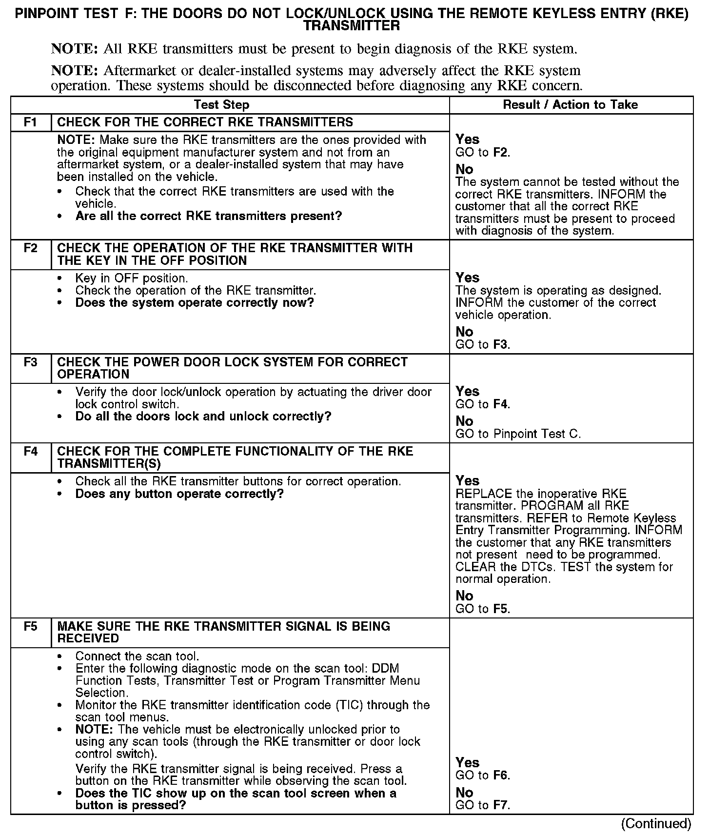 PINPOINT TEST F: THE DOORS DO NOT LOCK/UNLOCK USING THE REMOTE KEYLESS ENTRY (RKE) TRANSMITTERF1-F5: