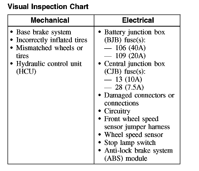 9. If the DTCs retrieved are related to the concern, go to the Anti-Lock Brake System (ABS) Module Diagnostic Trouble Code (DTC) Chart. For all other DTCs, refer to Body Control Systems (Multifunction Electronic Control Module). Diagnostic Trouble Code Tests and Associated Procedures