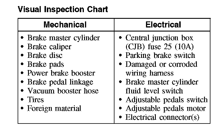 Changes in brake pedal feel or travel are indicators that something could be wrong in the brake system. GO to Symptom Chart for abnormal condition diagnosis. Symptom Related Diagnostic Procedures