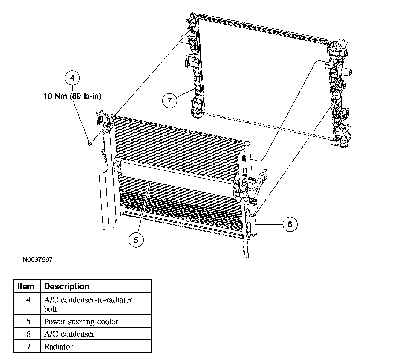 5. Remove the bolt, position the A/C condenser and the power steering cooler away from the radiator, and remove the radiator.