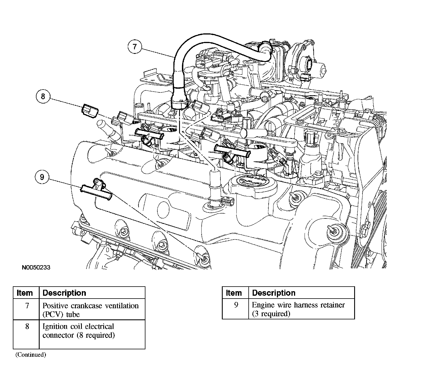 13. Disconnect the 3 wire harness retainers from the valve cover and position wire harness aside.