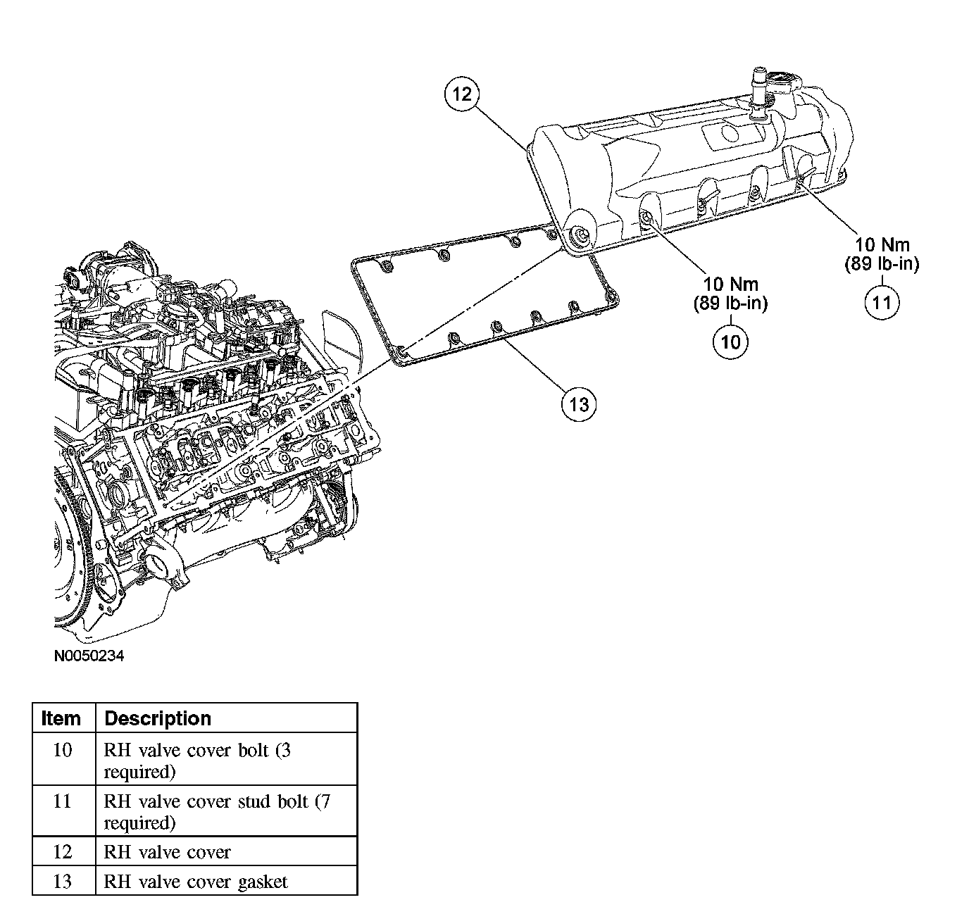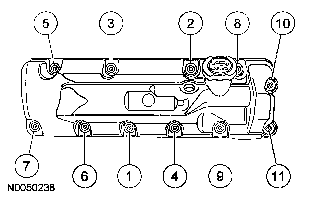 2. Install a new valve cover gasket and the valve cover. Tighten the 7 studs and 3 bolts in the sequence shown to 10 Nm (89 inch lbs.).