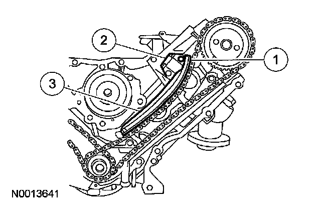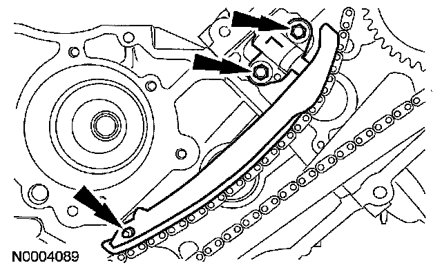 16. NOTE: The LH timing chain tensioner arm has a bump near the dowel hole for identification.