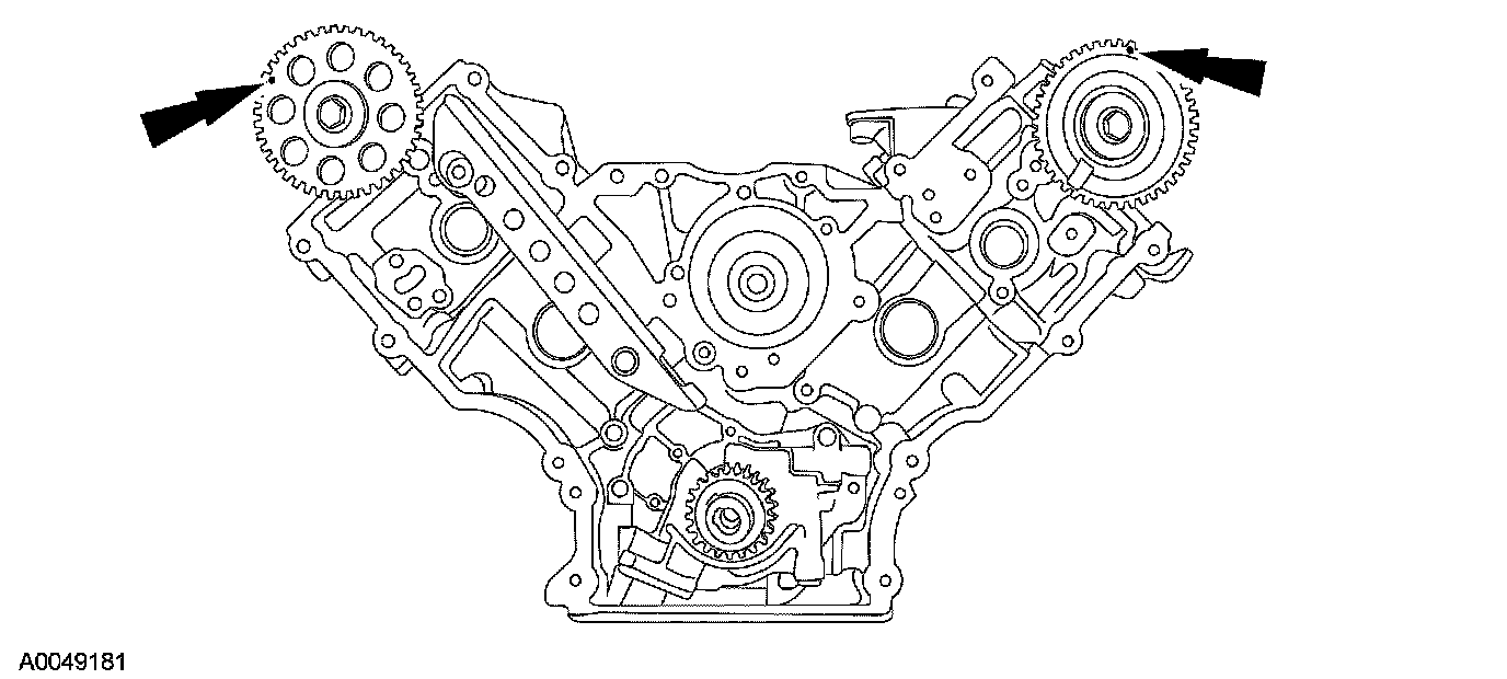13. Rotate the RH camshaft sprocket until the timing mark is approximately at the 11 o'clock position. Rotate the LH camshaft sprocket until the timing mark is approximately at the 12 o'clock position.