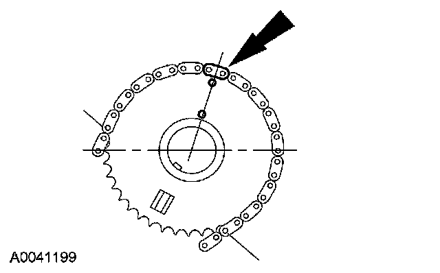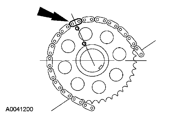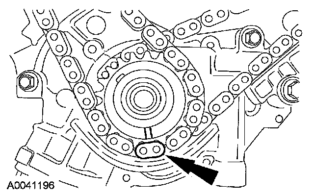14. Position the LH (inner) timing chain on the crankshaft sprocket, aligning the copper (marked) link with the timing mark on the sprocket.