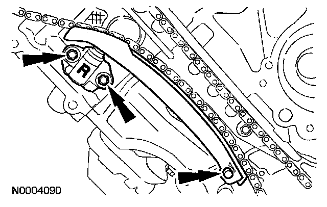 21. Position the RH timing chain tensioner arm on the dowel pin and install the RH timing chain tensioner.
