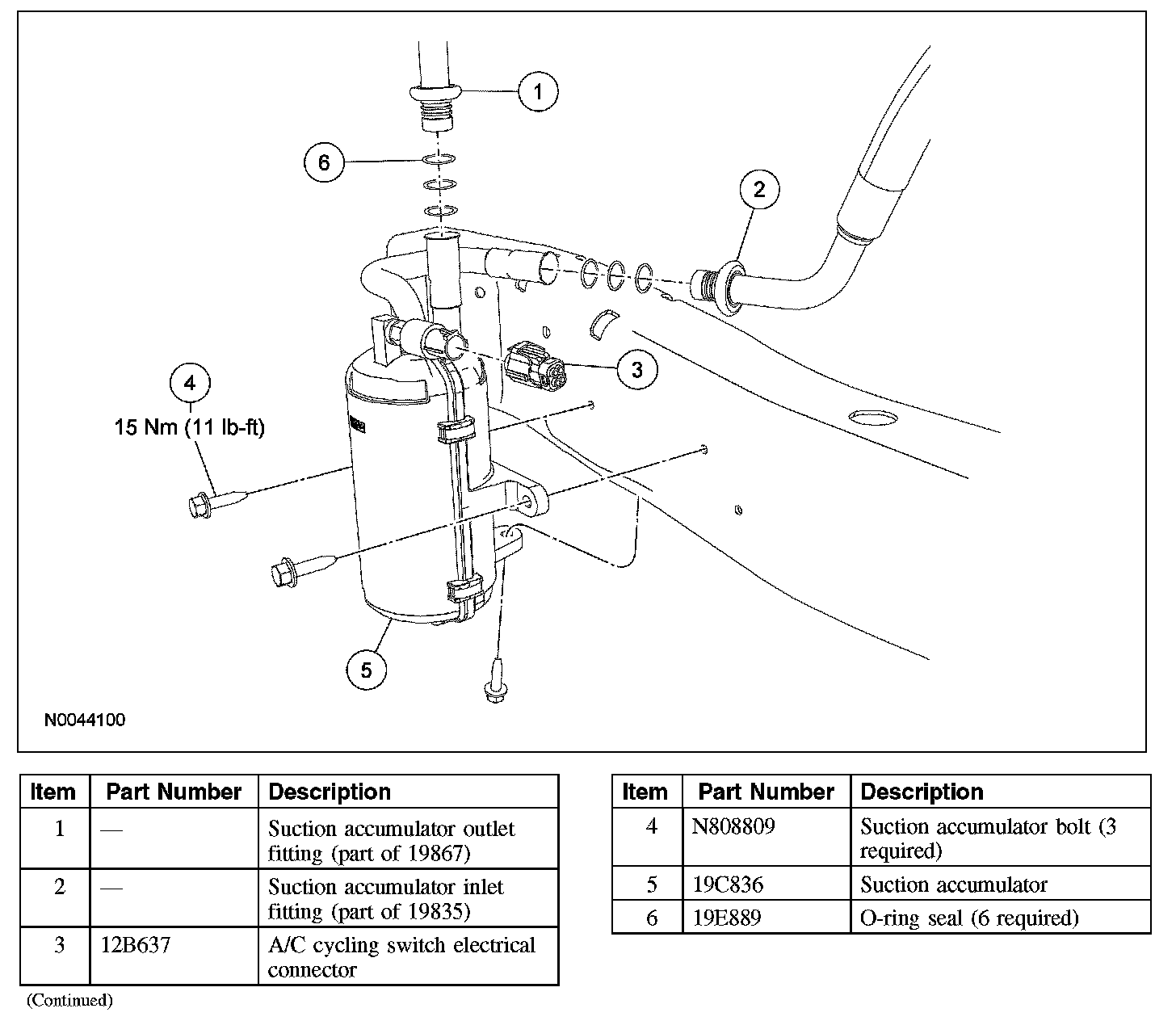 NOTE: Installation of a new suction accumulator is not required when repairing the air conditioning system, except when there is physical evidence of contamination from a failed A/C compressor or damage to the suction accumulator.