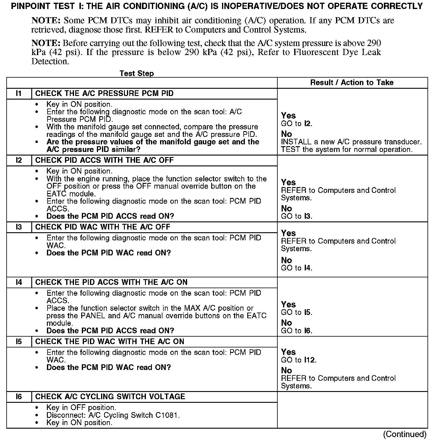 PINPOINT TEST I: THE AIR CONDITIONING (A/C) IS INOPERATIVE/DOES NOT OPERATE CORRECTLYI1-I6:
