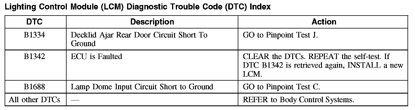Lighting Control Module (LCM) Diagnostic Trouble Code (DTC) Index