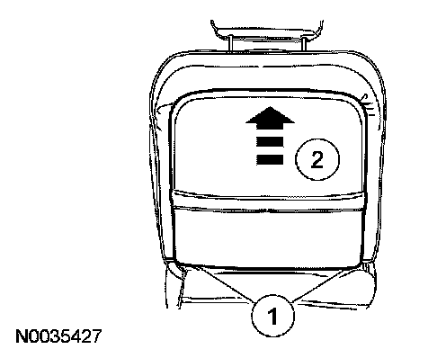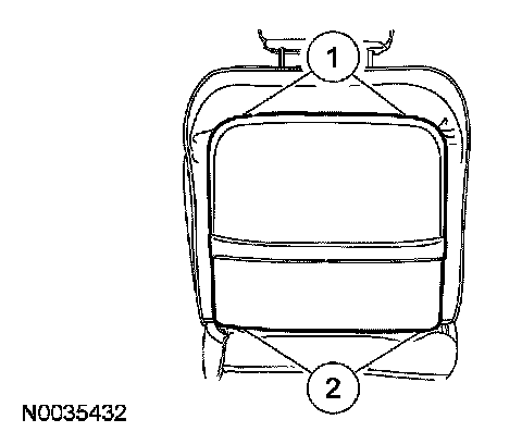 1 Angle the top of the seat back trim panel inward and down to engage the 2 upper retaining hooks to the seat back frame.