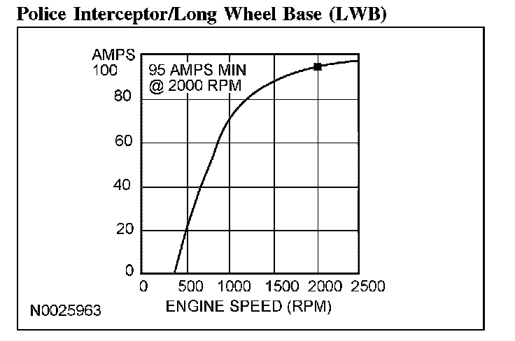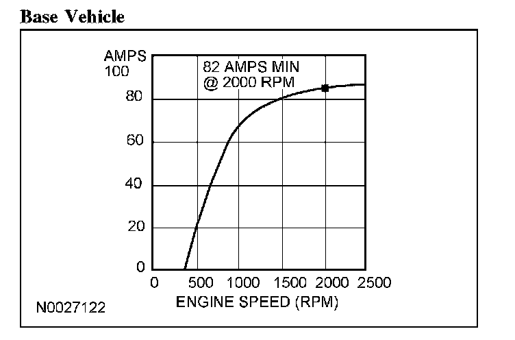 4. With the engine running at approximately 2,000 rpm, adjust the tester load bank to determine the output of the generator. The generator output should be greater than the graph shown. If not, refer back to the pinpoint test or GO to Symptom Chart. Pinpoint Tests Symptom Related Diagnostic Procedures