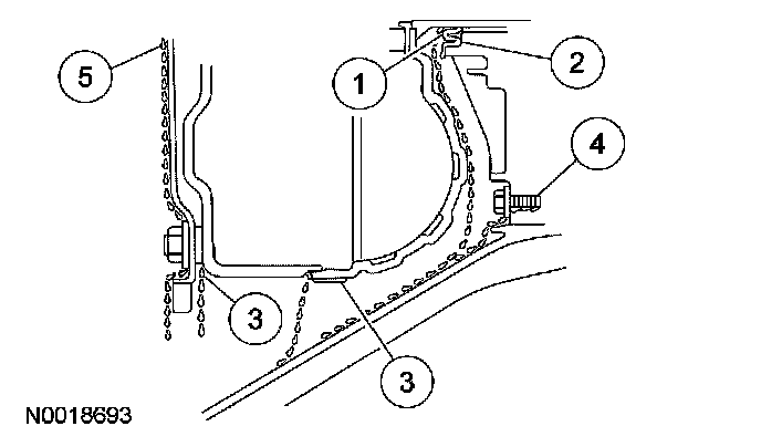 The paths which the fluid takes to reach the bottom of the torque converter housing part of the case are shown in the illustration. The 5 numbers in the illustration correspond with the 5 flow path steps.