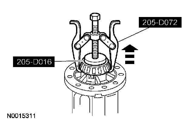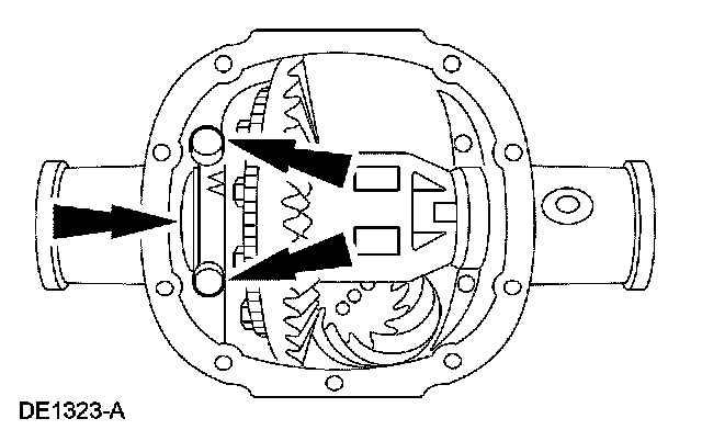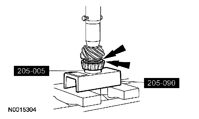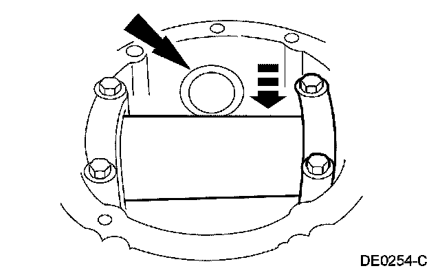 14. Using a brass drift, remove the drive pinion bearing cups by tapping alternately on opposite sides of the drive pinion bearing cups.