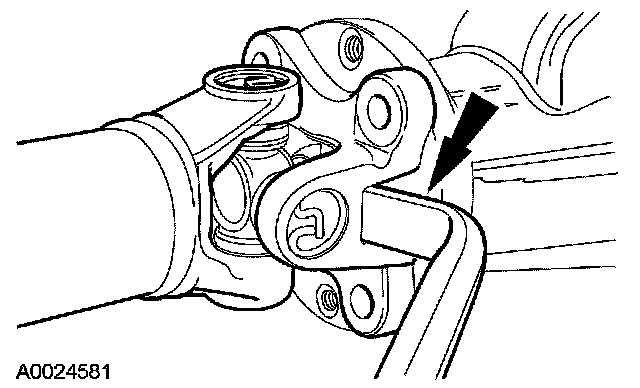 8. CAUTION: The driveshaft centering socket yoke fits tightly on the pinion flange pilot. Never hammer on the driveshaft or any of its components to disconnect the driveshaft centering socket yoke from the pinion flange. Pry only in the area shown with a suitable tool to disconnect the driveshaft centering socket yoke from the pinion flange.