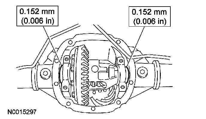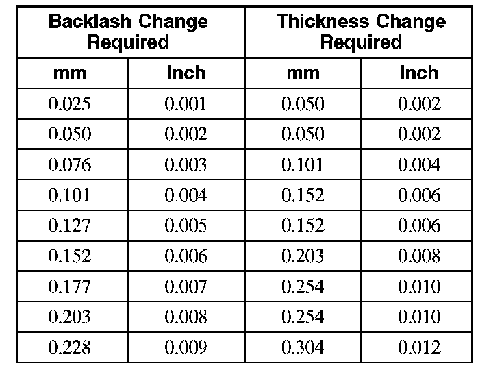 25. If a zero backlash condition occurs, add 0.50 mm (0.020 in) to the RH hand side shim and subtract 0.50 mm (0.020 in) from the LH side shim to allow a backlash indication. Go back to Step 24.