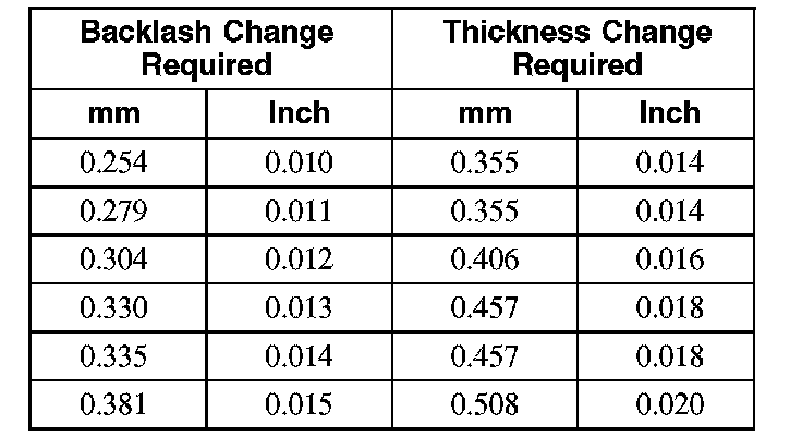 26. To correct for high or low backlash, increase the thickness of one differential bearing shim and decrease the thickness of the other differential bearing shim by the same amount. Refer to the following tables when adjusting the backlash. When the backlash is within specification, proceed to Step 27.