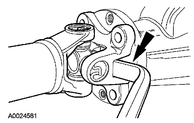 4. CAUTION: The driveshaft centering socket yoke fits tightly on the pinion flange pilot. Never hammer on the driveshaft or any of its components to disconnect the driveshaft centering socket yoke from the pinion flange. Pry only in the area shown with a suitable tool to disconnect the driveshaft centering socket yoke from the pinion flange.
