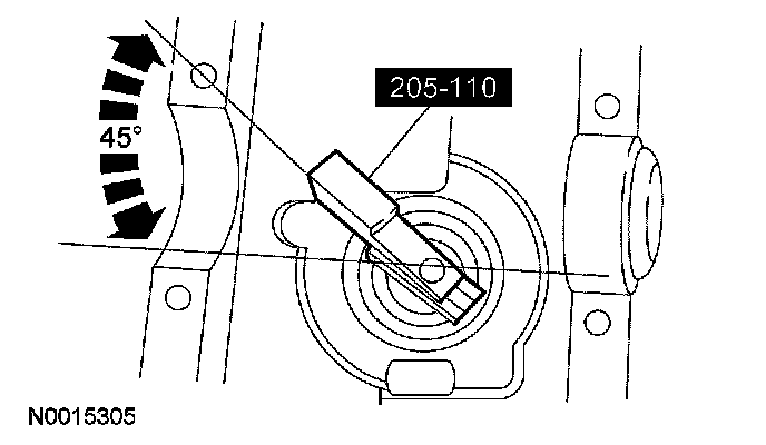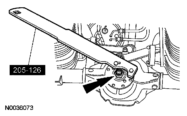 ^ Rotate the pinion occasionally to make sure the differential pinion bearings are seating correctly. Take frequent differential pinion bearing preload checks by rotating the differential pinion with a Nm (lb-in) torque wrench. Tighten the pinion nut in small increments to avoid excessive pinion bearing preload. Tighten the pinion nut until the drive pinion bearing preload is in specification.