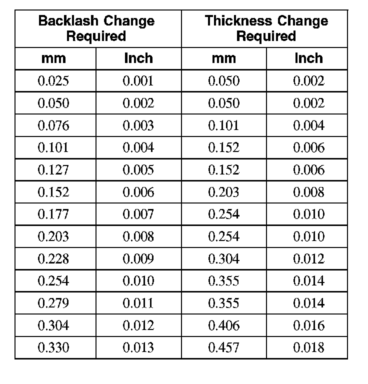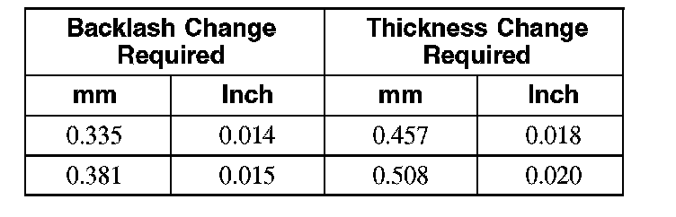 24. To correct for high or low backlash, increase the thickness of one differential bearing shim and decrease the thickness of the other differential bearing shim by the same amount. Refer to the following tables when adjusting the backlash. When the backlash is within specifications, proceed to Step 25.