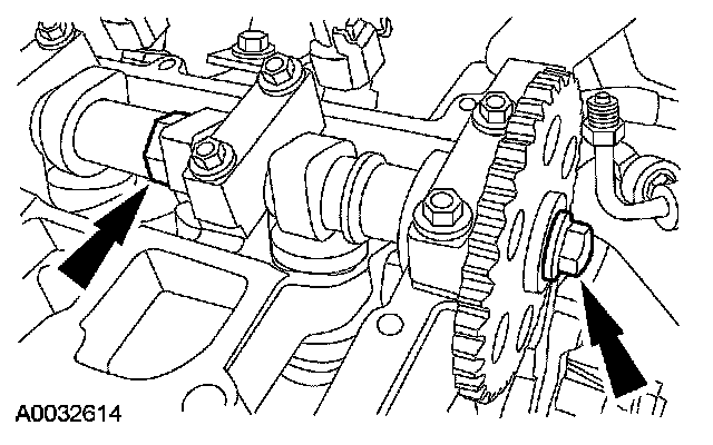 Using the flats on the camshafts to prevent camshaft rotation, tighten the sprocket bolts.