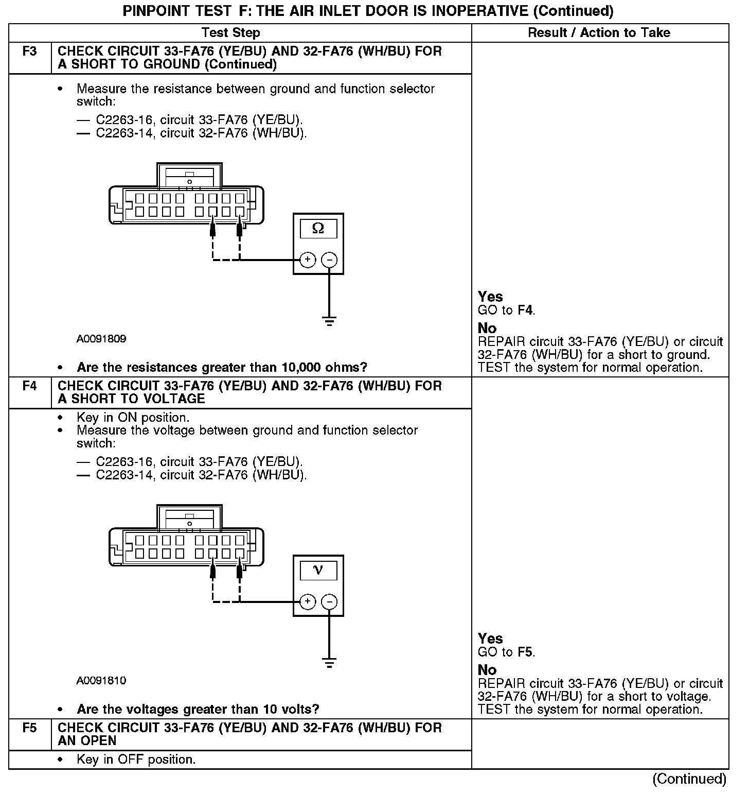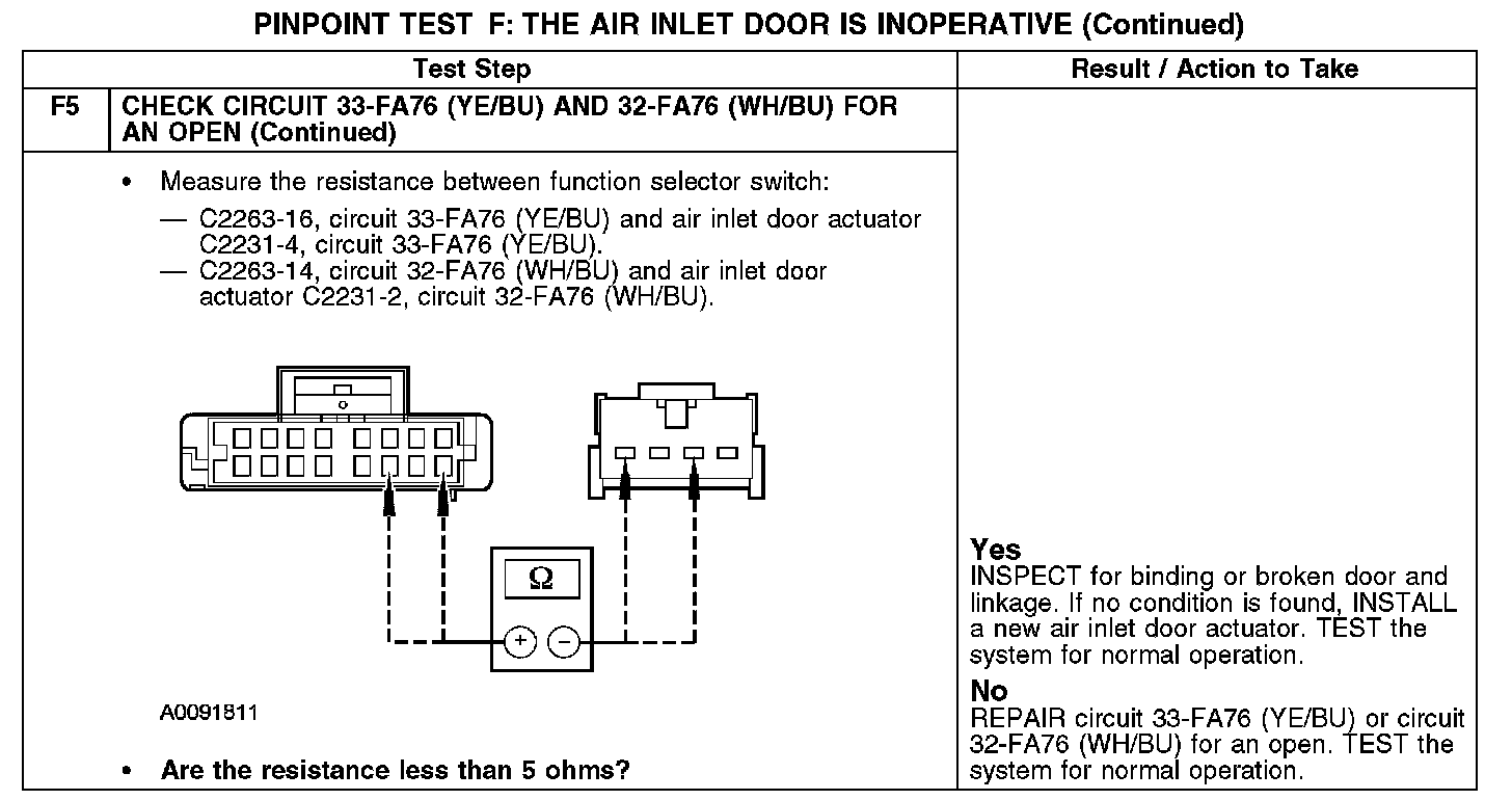 Under normal operation, the air inlet door actuator motor is supplied voltage or ground on circuit 32-FA76 (WH/BU), depending on desired actuator rotation. The appropriate voltage or ground is supplied to the other side of the actuator motor on circuit 33-FA76 (YE/BU).
