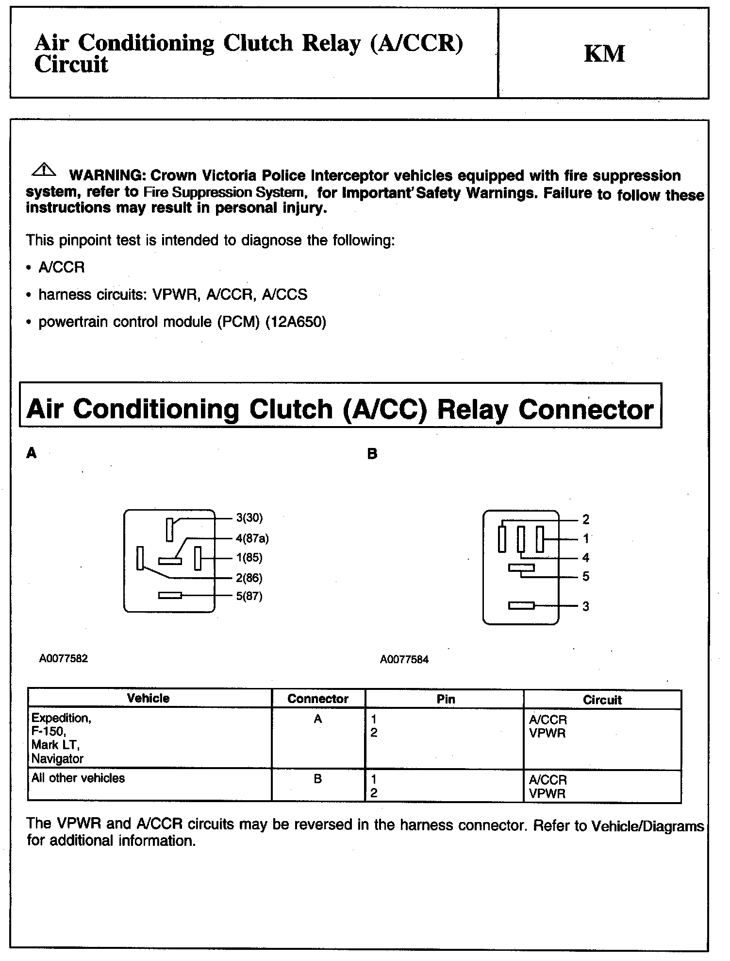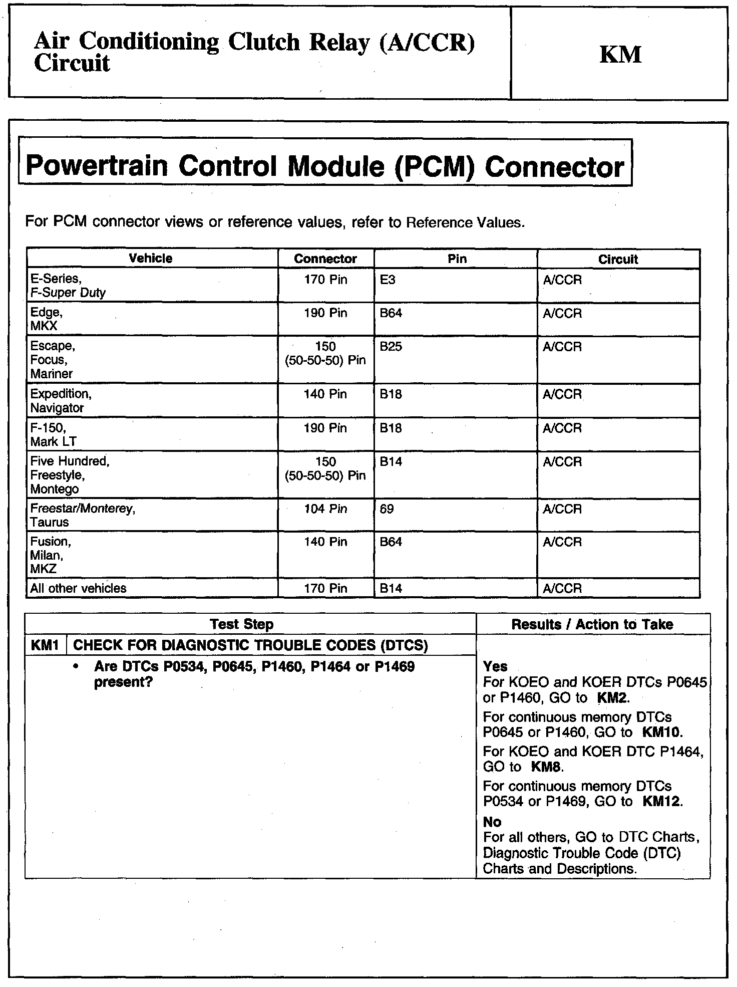 PINPOINT TEST KM: AIR CONDITIONING CLUTCH RELAY (A/CCR) CIRCUIT