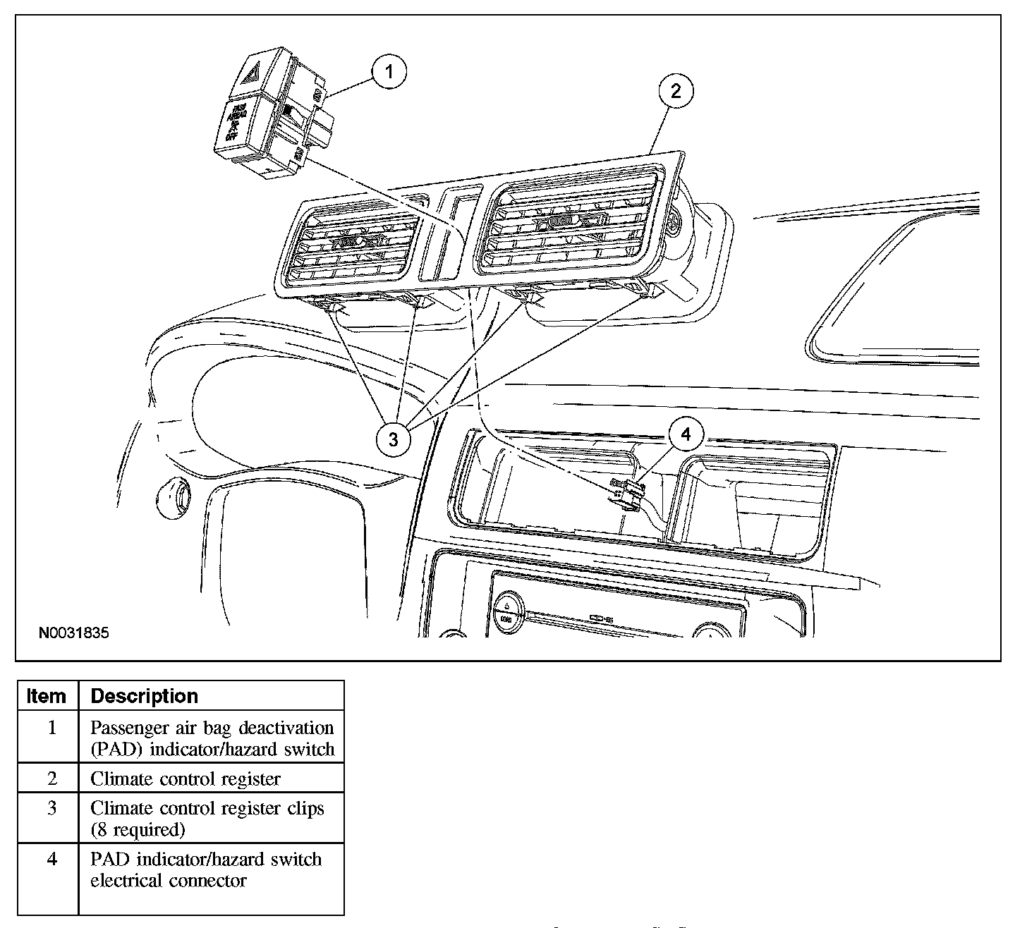 2. Carefully release the 8 clips and remove the PAD indicator/hazard switch assembly and climate control register.