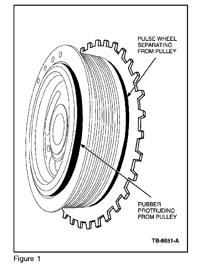 Inspect the crankshaft pulley for rubber protruding from the pulley (Figure 1), loose pulse wheel, or bent tabs on pulse wheel touching engine front cover. Replace crankshafl pulley with service kit for respective vehicle line.