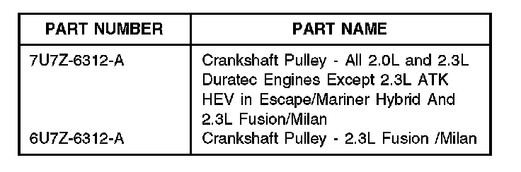 Some 2001-2007 MY vehicles equipped with a 2.0L or 2.3L Duratec Engine may exhibit no start, loss of engine timing or scraping noise at crankshaft pulley at front of engine. These engines, (excludes 2.0L SPI and Zetec engines) may experience engine damage if the crankshaft pulley bolt is loosened during service WITHOUT FIRST INSTALLING THE SPECIAL SERVICE TOOLS PER THE WORKSHOP MANUAL PROCEDURE. The crankshaft pulley bolt also retains the crankshaft cam drive sprocket which is NOT keyed to the crankshaft, so valve timing may shift if the crankshaft pulley bolt is loosened. If this occurs, the pistons may contact and damage the valves.