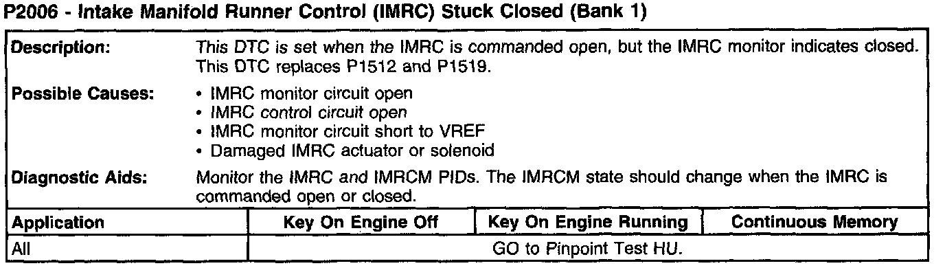 P2006 - Intake Manifold Runner Control (IMRC) Stuck Closed (Bank 1):