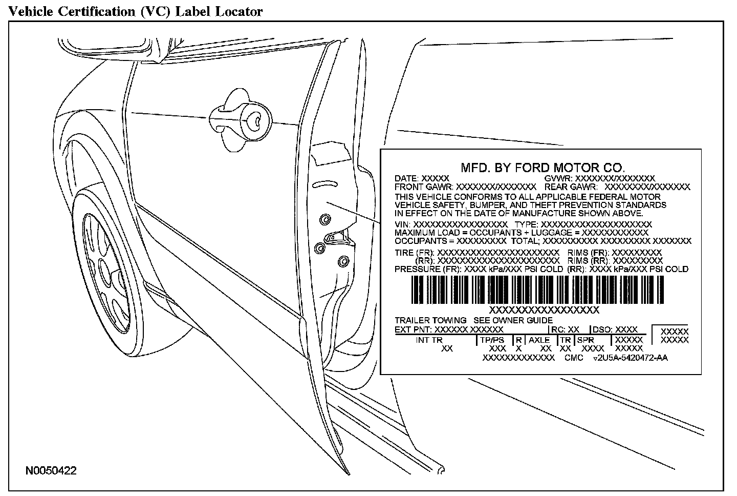 The vehicle certification (VC) label contains the manufacturer name, the month and year of manufacture, the certification statement and the VIN. It also includes gross vehicle weight ratings (GVWR) and tire information.