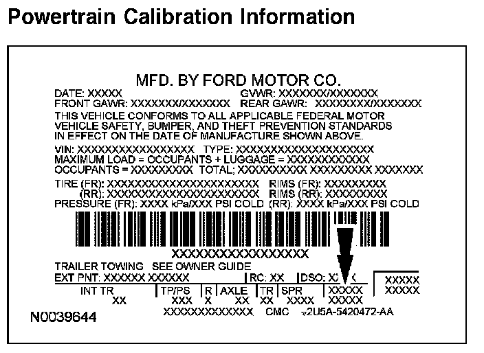 Powertrain calibration information is printed in the lower right corner of the vehicle certification (VC) label. Only the base calibration information is printed. Revision levels will not appear, however, they can be found in On Line Automotive Service Information System (OASIS).