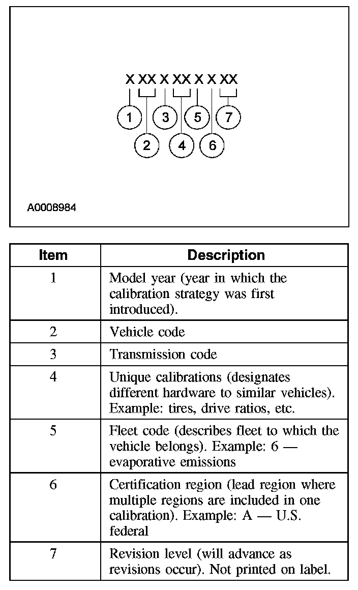 NOTE: Powertrain calibration information is limited to a maximum of 5 characters per line on the vehicle certification (VC) label. Because of this, calibration identification consisting of more than 5 characters will wrap to the second line on the VC label.