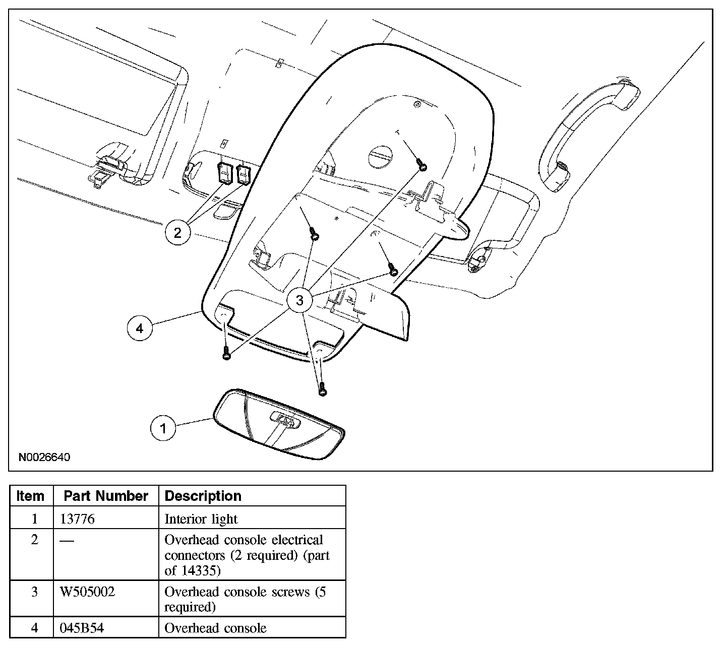 6. Remove the 2 retaining screws and remove the overhead console from the roof panel.