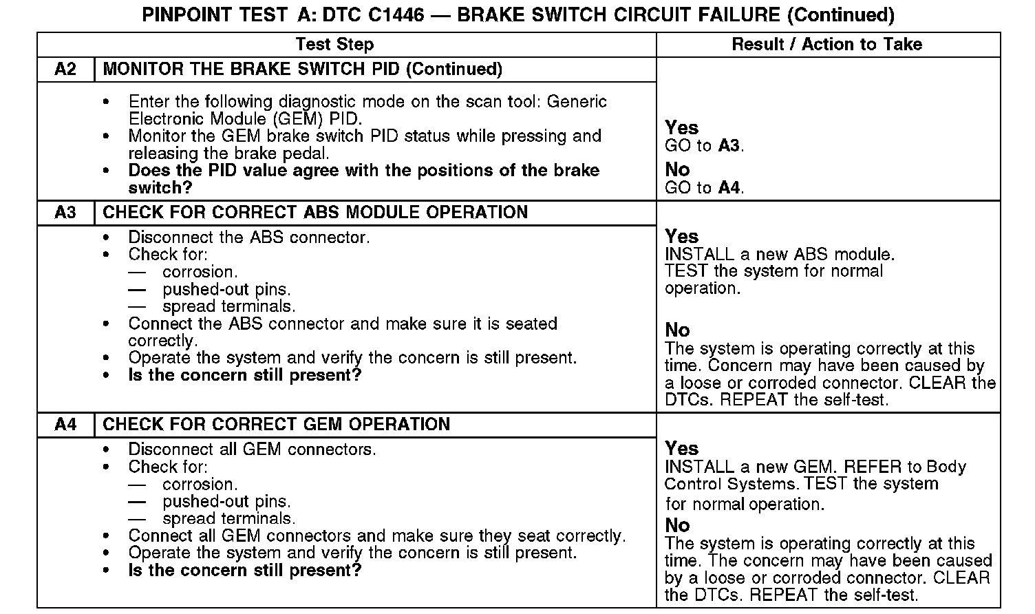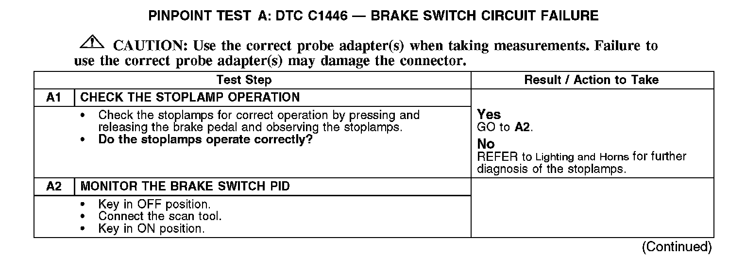 TEST A: DTC C1446 - BRAKE SWITCH CIRCUIT FAILURE
