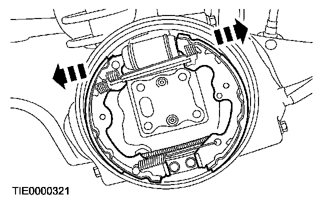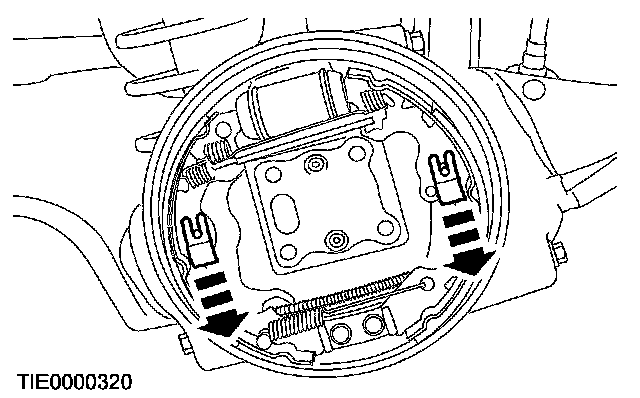 ^ Using a suitable tool, hold the wheel cylinder pistons in place.