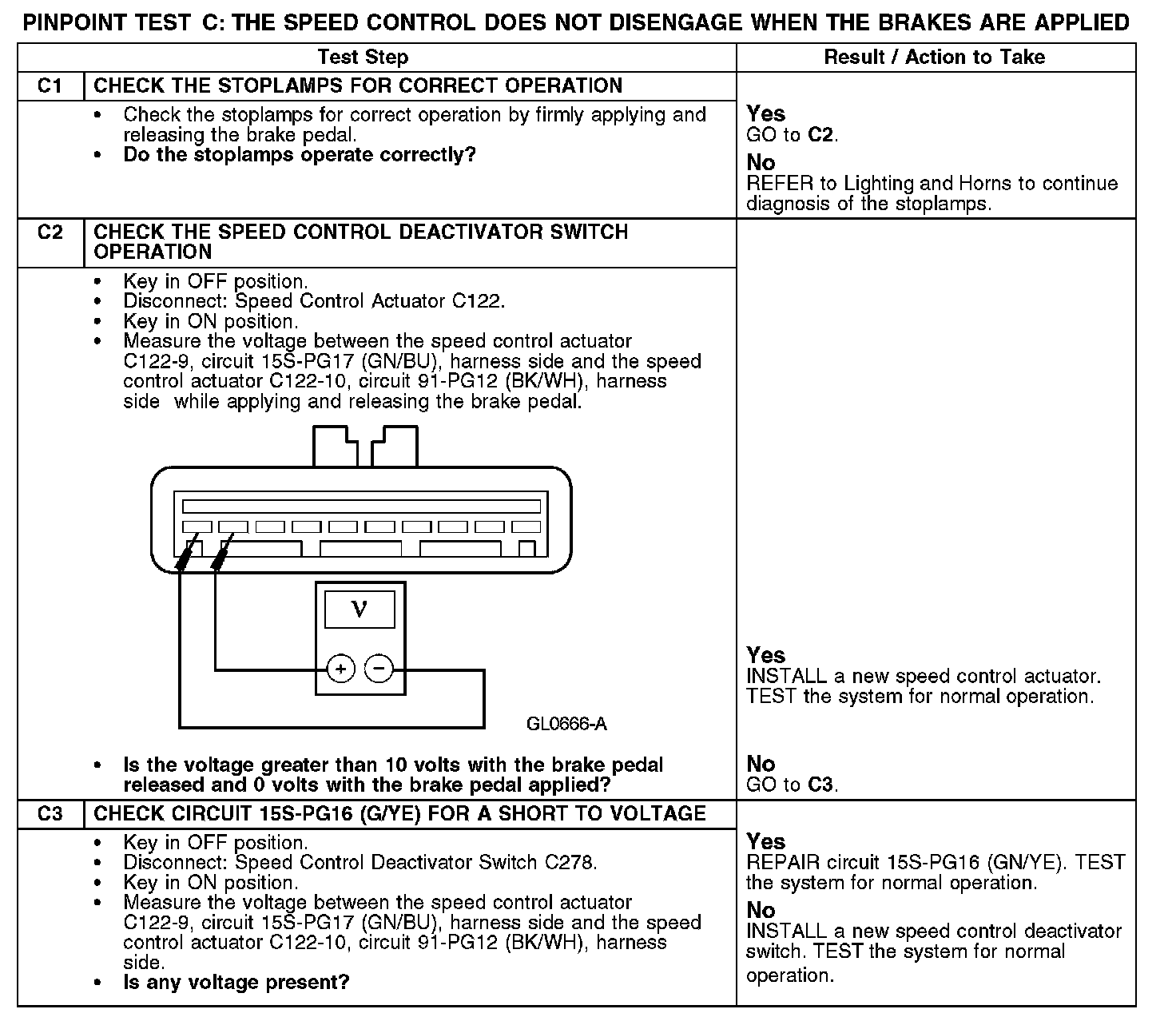 PINPOINT TEST C: THE SPEED CONTROL DOES NOT DISENGAGE WHEN THE BRAKES ARE APPLIED
